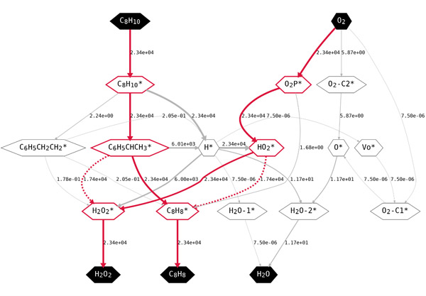 图3.反应网络及800 K,1 bar EB,1 bar O2条件下的物种转换速率。红色高亮部分为关键中间物种与反应路径,其中虚线表示自由基反应路径,线右侧的数字为物种转换的速率