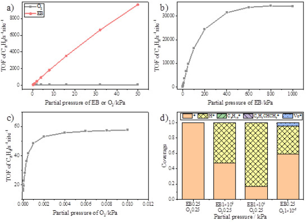 图2.不同条件下苯乙烯的生成速率以及相关主要物种的分布。a)乙苯或氧气分压为0.25kPa时,另一气体分压在0到50kPa变化时反应的速率,b)氧气分压为0.25kPa时,乙苯分压在0到1000kPa变化时反应的速率,c)乙苯分压为0.25kPa时,氧气分压在0到0.01kPa变化时反应的速率,d)不同分压下主要的吸附物种分布