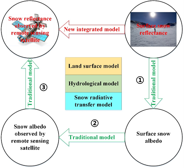 积雪表面光谱反射率在地球气候系统中占有重要地位。传统的陆面模型参数化方案仅能模拟宽波段的积雪表面反照率,无法准确模拟高光谱分辨率的积雪表面光谱反射率,而高光谱分辨率或窄波段的积雪光谱反射率却是目前大多数卫星传感器的主要观测数据。因此,陆面模型模拟与卫星遥感观测之间存在明显差距,发展能模拟超高光谱的地表反射率的陆面模型成为国际前沿研究关注的重要问题。