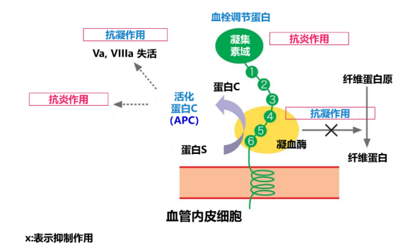 可用于评估体内纤溶系统的激活情况,正常参考范围为≦0.8 μg/mL。 PIC增高的临床价值: (1)DIC, DIC前期状态; (2)深静脉血栓(DVT),肺栓塞(PE); (3)在溶栓治疗的给药过程中(t-PA,尿激酶); (4)其他凝血系统激活状态。 图9 PIC和t-PAIC形成示意图 4.血栓调节蛋白(TM)的临床应用价值: TM最初发现于血管内皮细胞,与凝血酶结合后可降低凝血酶的凝血活性,而加强其激活蛋白C的活性。由于被激活的蛋白C具有抗凝作用,因此,TM是使凝血酶由促凝转向抗凝的重要的血管内凝血抑制因子。图10为