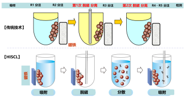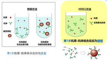 Corporation)免疫分析技术起始于上世纪80年代,研制成功并生产销售了PAMIA系列化学发光分析仪,期间在上世纪90年代,研制成功并生产销售了ELSIA-F系列全自动酶联免疫吸附分析仪。到2007年,HISCL系列高敏免疫化学发光研制成功,2012年HISCL-5000全球上市见图1。 图1 希森美康免疫分析技术发展过程 02 高敏免疫化学发光分析 核心技术的临床应用 1.脱磁清洗技术: 众所周知,无论是酶促化学发光免疫分析技术还是电化学发光免疫分析技术,其技术核心是抗原、抗体的免疫反应,由于磁场存在的原因,大多数全自动化学发光免疫分析仪抗原、抗体反应后的清洗就不会非常彻底,部分游离的(过量所致)抗原或抗体不能完全被清洗排除,就会对该项目的结果造成一定的干扰,我们称之为技术性灰区结果,灰区结果高会造成检测机构的工作效率降低、检测成本增加。HISCL系列在产品独特的脱磁清洗技术,在清洗时可将磁珠间隙中的游离的抗原或抗体完全清除,反应原理见图2。有学者的比较研究发现“Architect