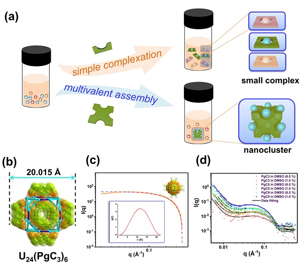 基于配位组装纳米团簇作为萃合物进行选择性分离的新方法:(a)锕系纳萃示意图;(b)铀酰配位纳米笼;(c)X射线小角散射表征结果;(d)中子小角散射表征结果