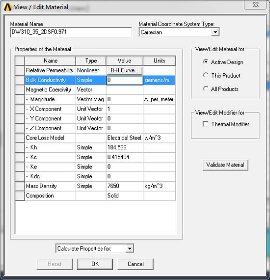 磁滞现象是铁磁材料的固有属性,电机、变压器使用的硅钢片属于软磁材料,剩磁与矫顽力都比较小,所以在电机设计过程中一般使用其平均磁化曲线,磁滞损耗包含在铁耗中,根据斯坦梅茨方程拟合计算其铁耗,这对电机、变压器稳态运行影响较小,但是在特殊工况下,磁滞现象会产生不良影响或者利用其特性开发新的产品。针对铁磁材料磁滞现象,在Maxwell V2014以及后续版本是如何处理材料建模的呢?