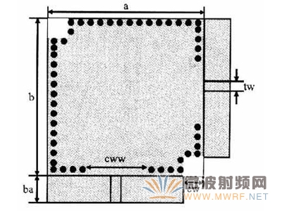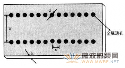 SIW是一类新型的人工集成波导,它是通过在平面电路的介质层中嵌入两排金属化孔构成的,这两排金属化孔构成了波导的窄壁,图1所示是基片集成波导的结构示意图。这类平面波导不仅容易与微波集成电路(MIC)以及单片微波集成电路(MMIC)集成,而且,SIW还继承了传统矩形波导的品质因数高、辐射损耗小、便于设计等优点。