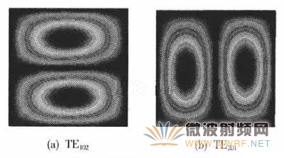 一般情况下,两个电路的振荡频率越接近,这两个电路之间的能量转换需要的耦合就越小。由于谐振腔中的无数多个模式中存在着正交关系,故要让这些模式耦合发生能量交换,必须对理想的结构加扰动。但是,为了保持场结构的原有形式,这个扰动要很小。所以,本文选择了SIW的简并主模TE102和TE201,它们的电场分布图如图2所示。因为TM和TEmn(n10)不能够在SIW中传输。因此,一方面可以保证在小扰动时就可以实现耦合,同时也可以保证场的原有结构。