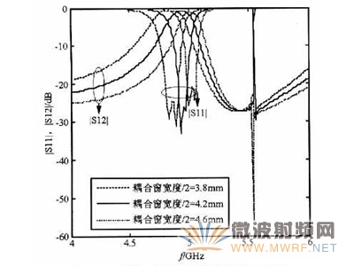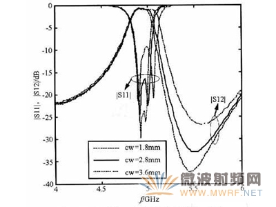 仿真可采用电磁仿真商业软件HFSS来完成。通过仿真介质谐振腔滤波器(滤波器源型)可以发现,不同的耦合输入/输出窗口宽度影响着滤波器中心频率的位置,同时也影响耦合强度和带内插入损耗。从图5中看出,随着耦合窗宽度的增大,滤波器的中心频率会上移,耦合减弱,带内插入损耗变大,也就是滤波器的匹配性能变差。