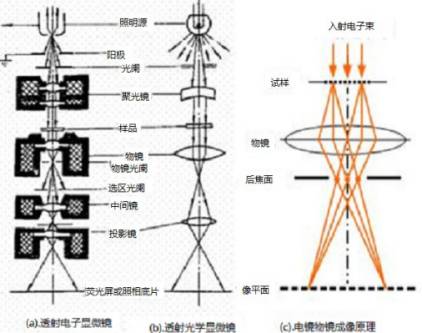 透射电镜和光学显微镜的各透镜及光路图基本一致,都是光源经过聚光镜会聚之后照到样品,光束透过样品后进入物镜,由物镜会聚成像,之后物镜所成的一次放大像在光镜中再由物镜二次放大后进入观察者的眼睛,而在电镜中则是由中间镜和投影镜再进行两次接力放大后最终在荧光屏上形成投影供观察者观察。电镜物镜成像光路图也和光学凸透镜放大光路图一致。