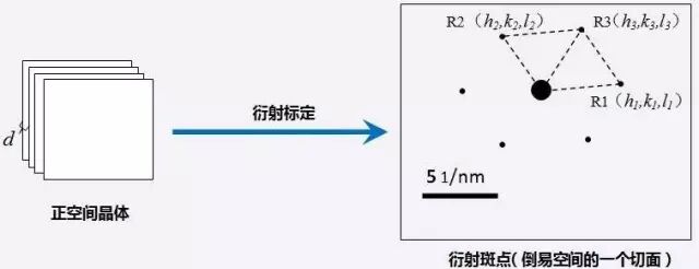 将我们之前计算的d1、d2、d3,<R1,R2>、<R2,R3>、<R1,R3>拿到数据库中比对,如果误差较小就挑选出来,挑出来晶面指数还要满足另外一个条件,就是R3=R1+R2,矢量的加法法则。如果能够从数据库里面找到这样的晶面指数满足了以上所有条件,那么恭喜你,你已经可以标定你的衍射斑点图了。