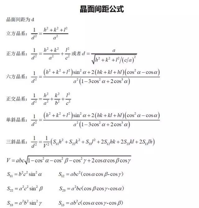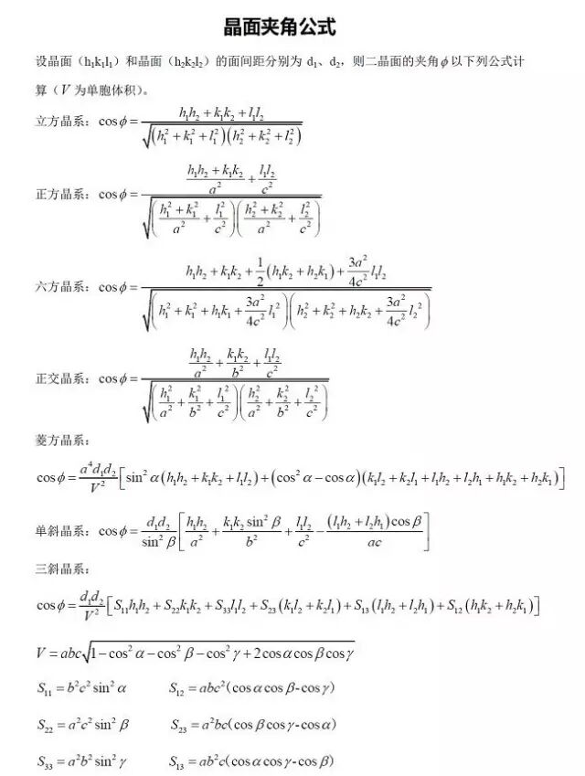 此后,将你挑选出来的指数代入公式进行晶面夹角计算(文末附有所有类型的晶体的晶面间距公式和晶面夹角公式)。